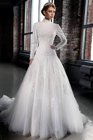 Informal modest beach scoop neck lace chiffon wedding dress with 3 4 sleeves 4 63 reviews 8 endearing jewel neck lace long sleeve tulle floor length wedding dress with sweep train. Winter brides this one s for you. Vintage beaded lace high neck wedding dresses with long sleeves.