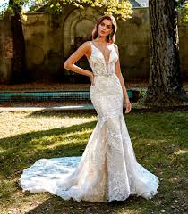 This style of dress can easily be confused with its sister silhouettes the trumpet and the mermaid while all three dresses fit tighter on top and flare at the bottom the difference between them can be noticed at the point of the hip at which they begin to flare. Delicate strap detailing or a stunning v neck lace wedding dress dipping into a plunging v neck design is flattering and flirty. Shop the simple elegant collection of satin wedding dresses and bridal gowns 2021 with the best.